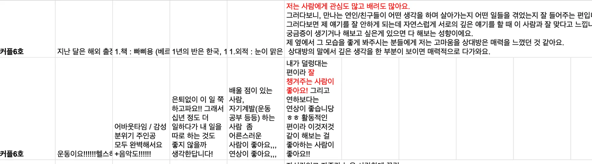 여자5호: 본인입으로 덜렁거리는 사람이라고 함. 챙김 받는 것, 연상을 선호하는 것에서 이것저것 챙겨주는 것에서 감동을 느끼는 여성이라는 것을 알 수 있음