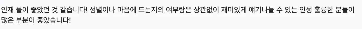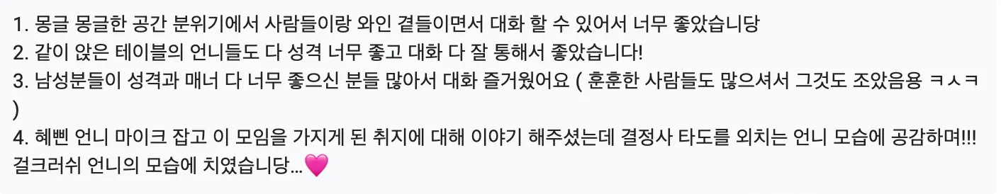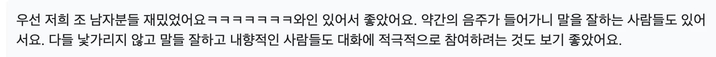 ㅋㅋㅋㅋㅋ 나는 심오한 이야기하는거 좋아해서 힘들어할 줄 몰랐싸요 ^^ㅋㅋㅋㅋㅋㅋㅋㅋ 질문보고 난 꺄 재미있겠따!!!!!! 이랬는데 하~ 이기적인 호스트엿삼… (근데 나도 막상 받아보니까 말이 안나오긴 하더라 지송~)다음엔 좀 더 라이트한 대화 주제를 준비볼게용