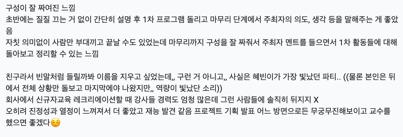 게다가!! 피드백을 주는 방식 타임라인에 맞춰서 쫙~서술해주셨는데 기획하는 입장에서 회고하기 매우 편했어용 (IT쪽으로 넘어오셔도 일 잘하실 듯! 탐나는 인재..) 뭔가 저랑 일하는 방식 매우 잘맞을 것 같은데 언젠가 회사 때려치고 싶다하신거 그냥 지금 같이 퇴사하고 일을 해보는건 어떤..지?웅 ??ㅎㅎ?ㅎ?ㅎ?