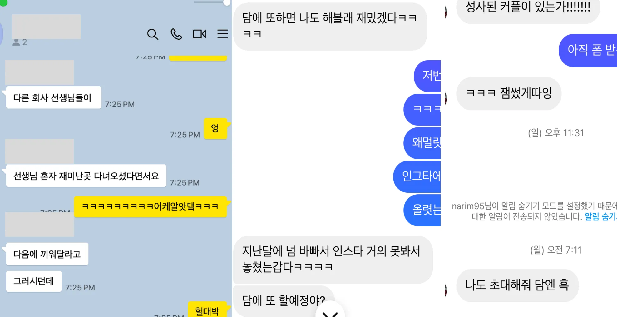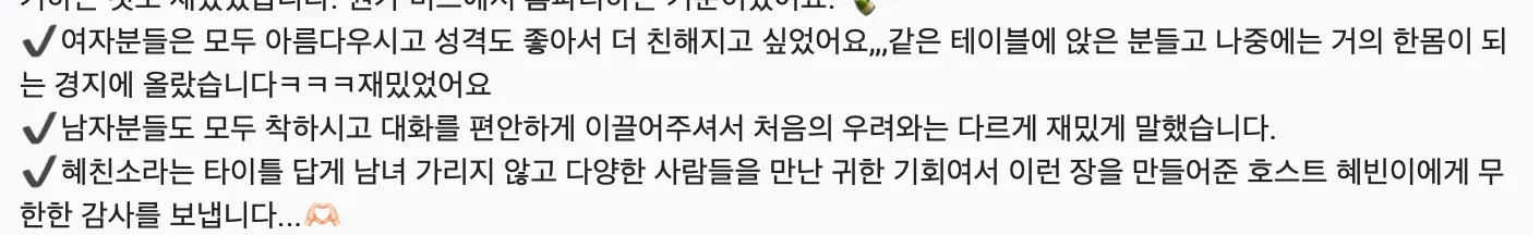젤 많이 들은게 이건데 나중에 뭐 자리 마련하던가 하겠썀.. ! 사실 2차는 방목으로 냅둬서 친해질 줄 알았는데 1차에서 먼저 간 사람들이 엄청 아쉬워하더라고? 다음에는 남녀 대화 뿐만 아니라 남남 여여등 친해질 수 있는 프로그램을 짜보겠습니다.