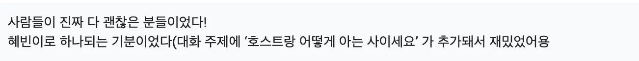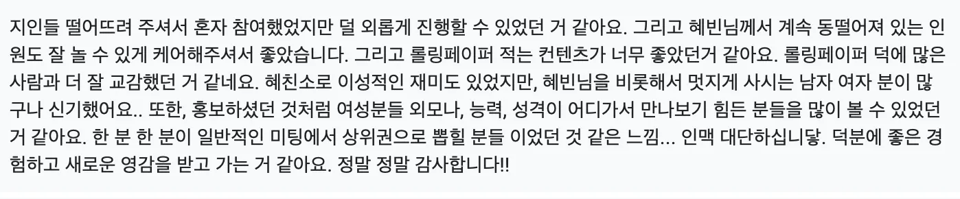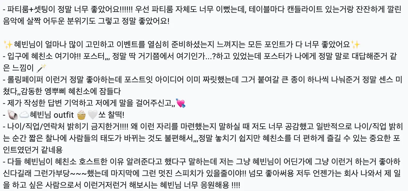 직업병이라 그런지 혜친소를 기획할 때도 UX를 엄청 따지면서 기획했는데, 각 단계별로 제가 의도했던 바를 파악해서 깜짝 놀랐고, 그 의미에 감동받고 좋아하시니까 너무 쀼듯했어용 🥹. 특히 롤페 붙일 종이 나눠줄 때 넘 감동받아하니까 나도 막 가슴 뻐렁차구! 막 심장 몽글몽글 🫧해져짜나~~