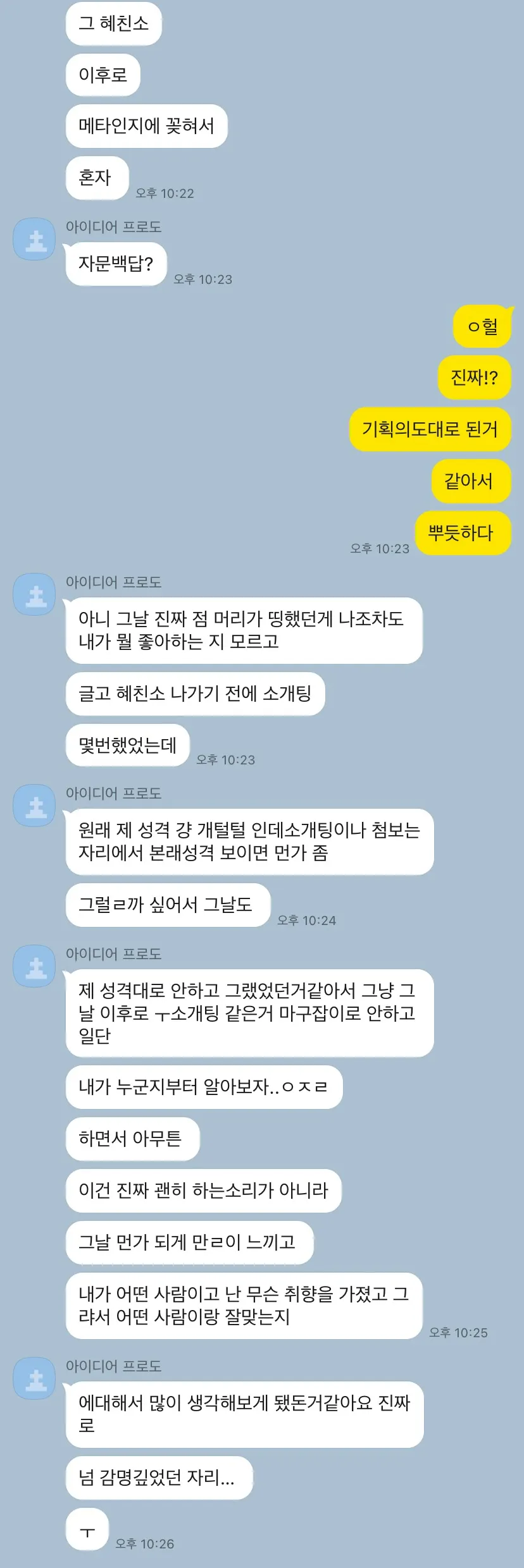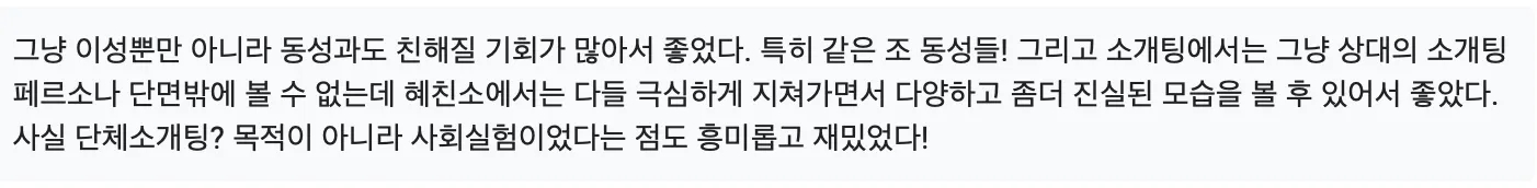 진짜 젤 뿌듯하고 뻐렁찼던 후기…이거 2차 때 돌아다니면서 몇명한테 이야기한 것 같은데, 사실 이성 만남 파티는 미끼고 ^^,, 혜친소의 가장 궁극적인 목적은 이성을 고르는 기준을 남이 아닌 내 기준으로 바꿔놓는 것 이었습니다. (듀오적 사고 타파 ^^)