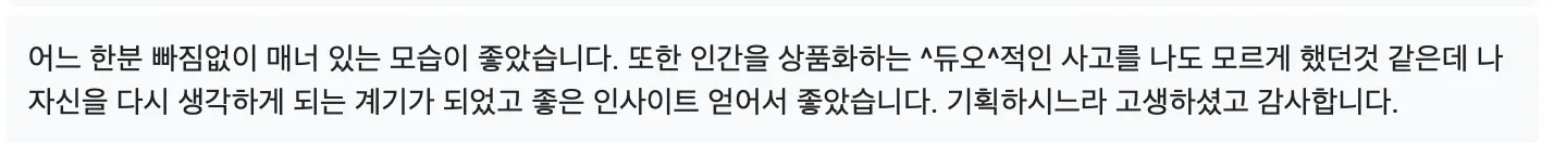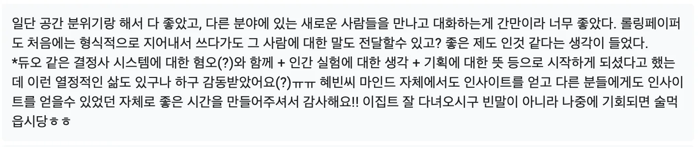 살아가면서 직업이든 뭐든 다양한 선택을 할건데 그 순간마다 남들이 보기에 좋은거~~ 남들에게 선택이 잘 되는거~ 기준으로 선택하는 게 요즘에 너무 당연시 된 것 같아요. 저는 이 태도 하나에서 파생되는 문제들이 진짜 많다고 생각하거든요. 연애 카테고리가 가장 사람 모으기 쉬우니까 혜친소를 한거긴한데 ㅎ ㅠ ㅎ …. 여하튼 혜친소 참가자 모두 그날을 계기로 (1) 본인에 대해 고찰해보고 (2) 본인 기준이 확고해지고 (3) 어떤 선택에 있어서 그 기준대로 선택하는 힘이 생겼길 바라용… 비단 연애에 한정된 이야기가 아니라 일이든 뭐든 다 ~~