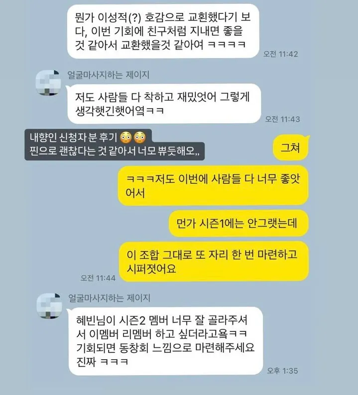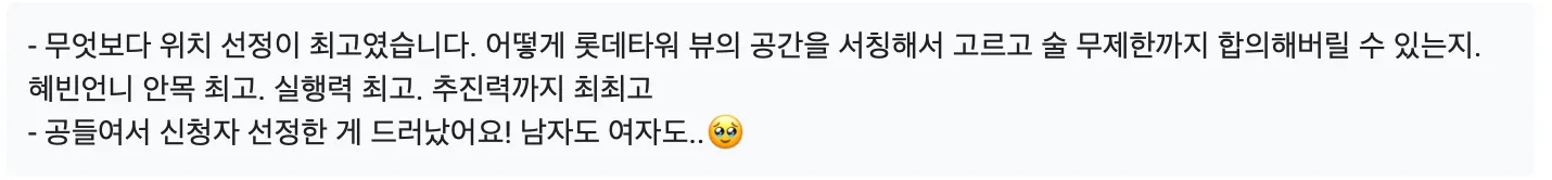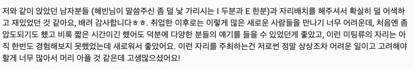 저도 뽑아 놓고 놀란게, 이게 이성적인걸 떠나서 사람들 자체가 넘나 다 좋아서 깜놀했어요. 분위기 좋아서 3차까지 가는거 보고 기겁(?)