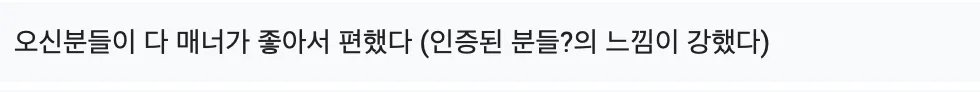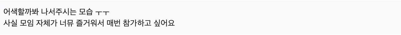 대중교통 시간 때문에 미리들 와 계시는 경우가 있는거 같아서 시작시간 10-15분 전에는 입장 받아주시면 좋겠다는 생각이 들었습니다!