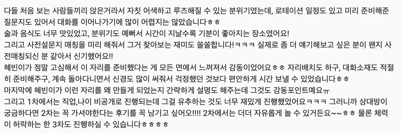 들리는 썰로는 남자들끼리 간간히 연락한다 그러고 여자들도 마찬가지로 거기서 만난 분 넘 맘에 들어서 따로 밥까지 먹었다 하더라고요 ? 단순 소개팅 이런게 아니라 리얼 내 친구끼리들 소개합니다 된 것 같아서 왕 쀼듯해요.