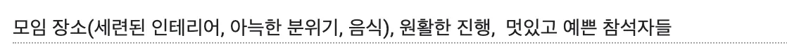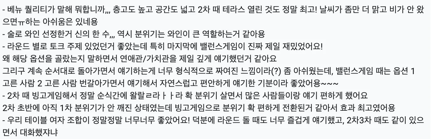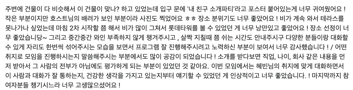 여러분들 더 재밌으라고 사전에 성향 매칭하나하나 해주는거 …그 외 기타 게임 준비든 뭐든…그냥 나중에 시간 되시면 문토나 프립 등 그냥 다른데서 하는거 한번 가봐라! 이정도로 해주는데 없다고! ㅋ 흥 ㅡㅡ 아 글구 돈으로 계산 자꾸 때릴꺼면 시장조사하고 때리십쇼. 원래 유료 1:1 소개팅만 5-6마넌입니다. (밥 술 제외) 흥ㅡㅡ