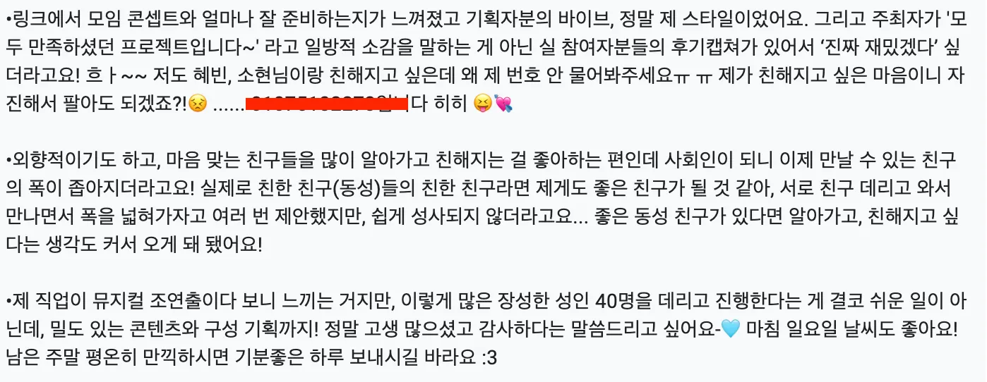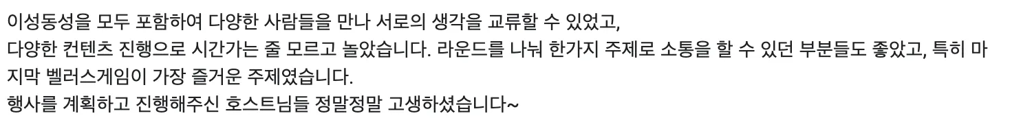 혜빈이랑 와주신 여러분덕분에 제가 더 즐거운 경험을 할 수 있었네요. 여러분들도 충분히 즐거운 자리였길..* 이번 혜친소를 통해서 내가 어떤 사람이고 어떤 사람을 좋아하는지 계속 고민하면서 앞으로 더 건강한 연애 이어나가시길 바라고요. 우리 돌고돌아 또 또 또 만나요! 와주신분들 무한 감사!🫶🩷