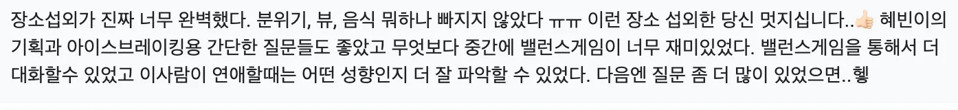 사실 이런 룰이 좀 호불호가 갈릴 수 있는데, 그럼에도 불구하고 좋게 느끼고 기획의도에 맞게 이런 후기를 남겨주시니 너무 뿌듯해여!!!!!!!감사합니다.