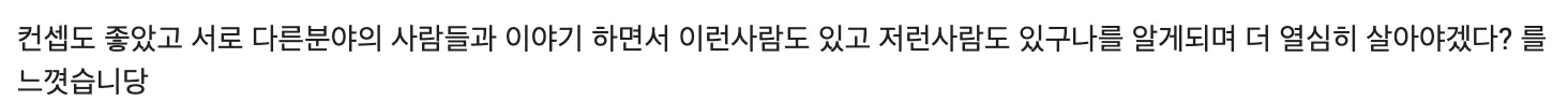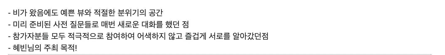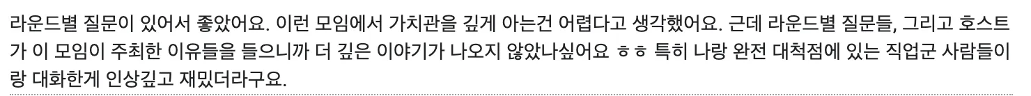 종종 피드백에 직업부터 이야기했으면 좋겠다고 간간히 들려오는데 저는 이걸 의도적으로 지양해요. 왜냐면 대부분 사람들이 직’업’ 보다는 직’장’으로 본인 아이덴티티를 표현하기도 하고, 직업 외에 다른 걸로 본인을 표현해보려고 했을 때 아 말하기 어렵다를 느끼는 순간! 그때부터 나에 대해서 생각해보려는 계기를 줄 수 있을 것 같거든요. 이런 이유로 직업 및 나이를 제외하고 대화하라 합니다.