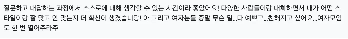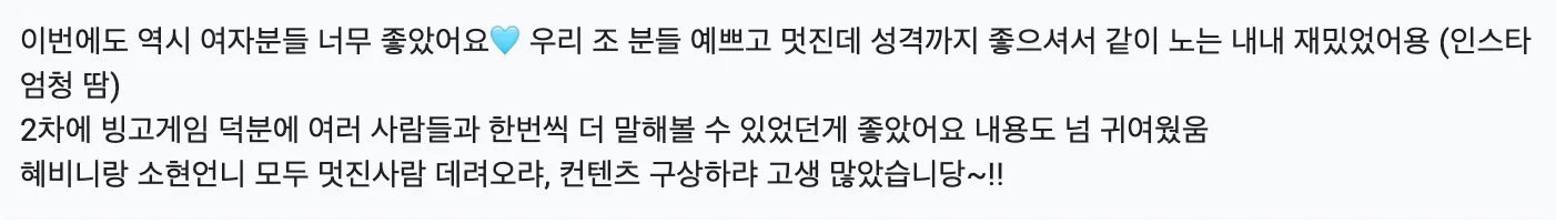우리 다른 여자들도 번호 안물어봤어여!!!! 그치만 이런 플러팅 너무 좋아요…. 바쁜거 끝나구 이번엔 제가 플러팅을 하겠뜸니다 기다려쥬 ~~~ 아 글구 모든 피드백 하나하나 정성스럽게 작성해주셔서 너무 감사해요 보통 친구 아니면 이렇게 열심히 잘 안써주거등여 🥹 저랑 쌩판 남.. 이시지만 이렇게 정성스럽게 하나하나 피드백 주셔서 감동…