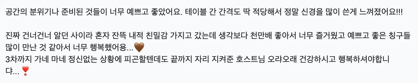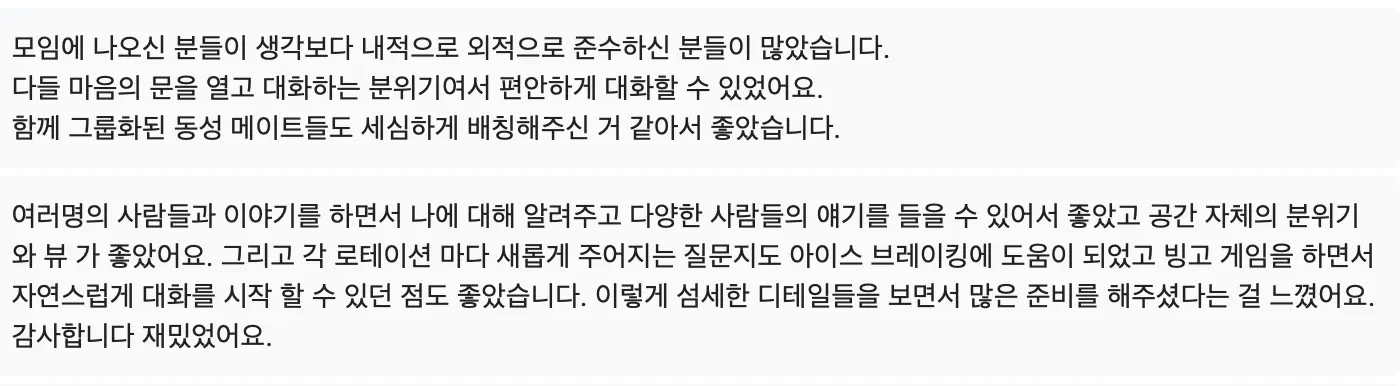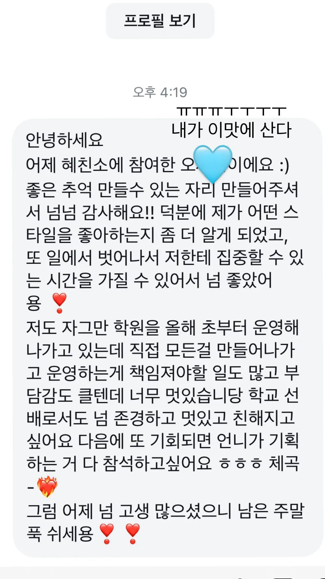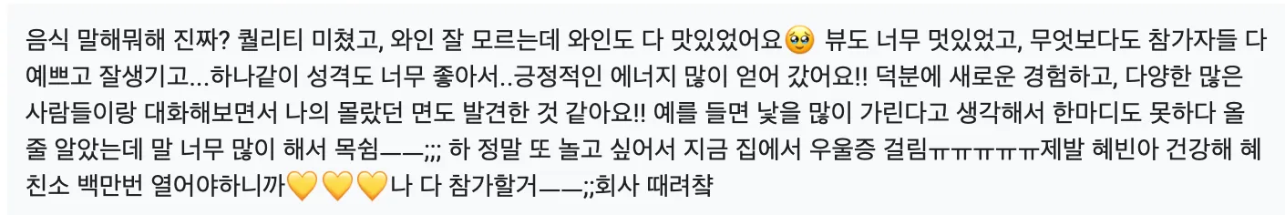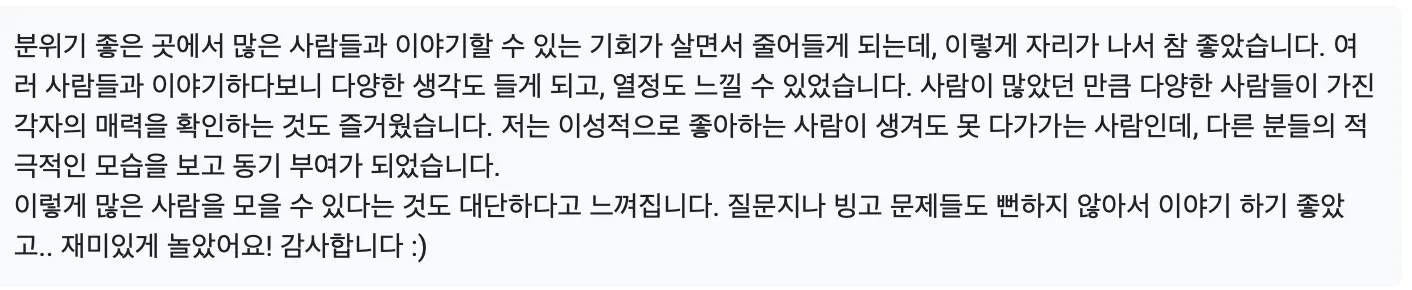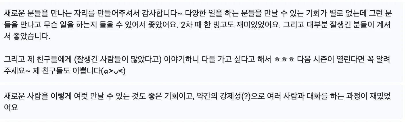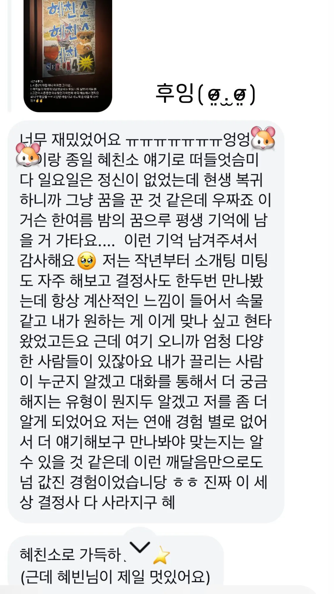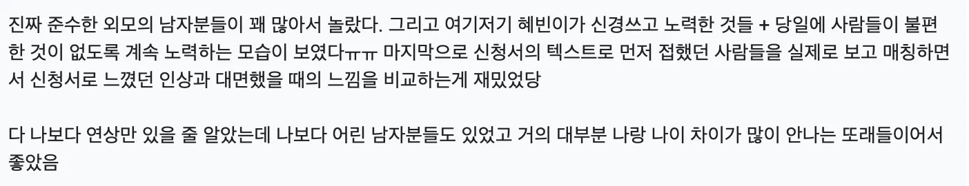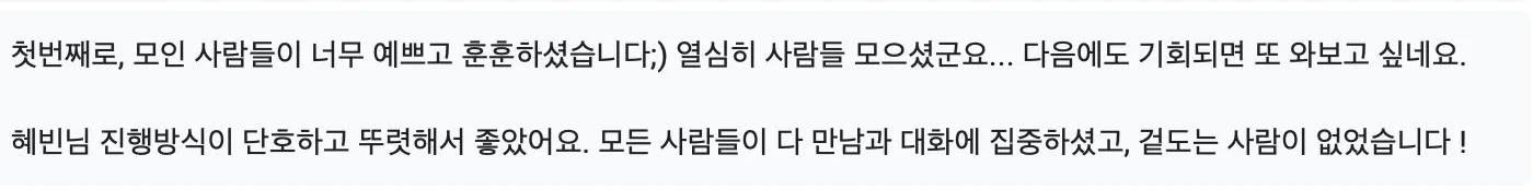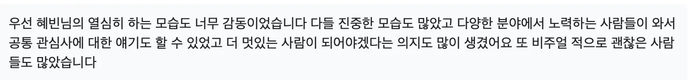 2. 참가자님과 이런 자리가 안맞는다는 사실을 깨달았다는 것도 나는 좋음 ㅋㅋㅋㅋㅋㅋㅋㅋ 뭐든 나는 그냥 혜친소에서 와서 이사람이 아 나는 이런 사람이구나~ 를 깨달았으면 좋겠따고 생각했는데 딱 그 의도에 맞게 느끼시고 가신 것 같아서 흡족해요 (또 오지 못하겠지만,,, 아쉽긴 함 ,, 친구 꼭 보내줘요 🩷)