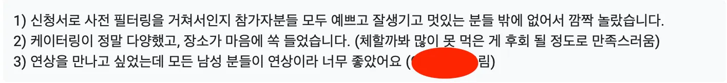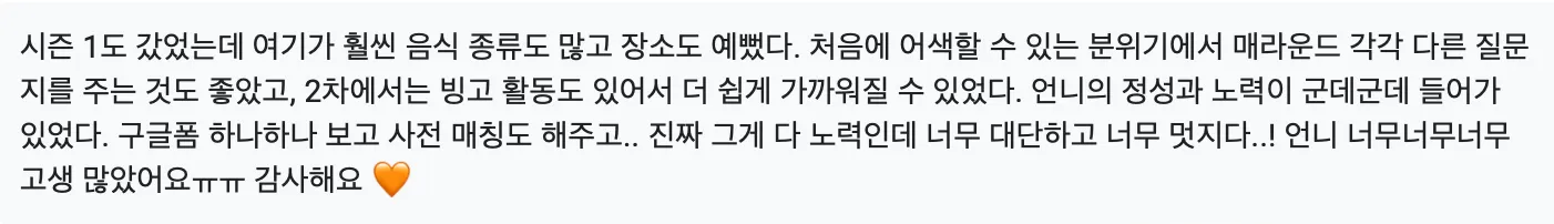 1. 역대 모든 시즌을 통틀어서 남자분이 이렇게 자세한 후기를 남겨주신건 처음이었습니다. 진짜 왕 감동 ….진짜 이렇게 세세하게 쓰는 남자 못봤는데….. 전 시즌 1등입니다.