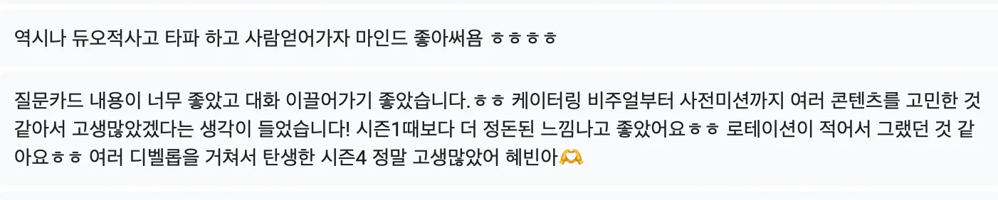 나도 사람인지라 사람들이 좋고 예의 바를 수록 하나라도 더 챙겨주는데 시즌4 사람들은 진짜 하나라도 더 챙겨주고픔