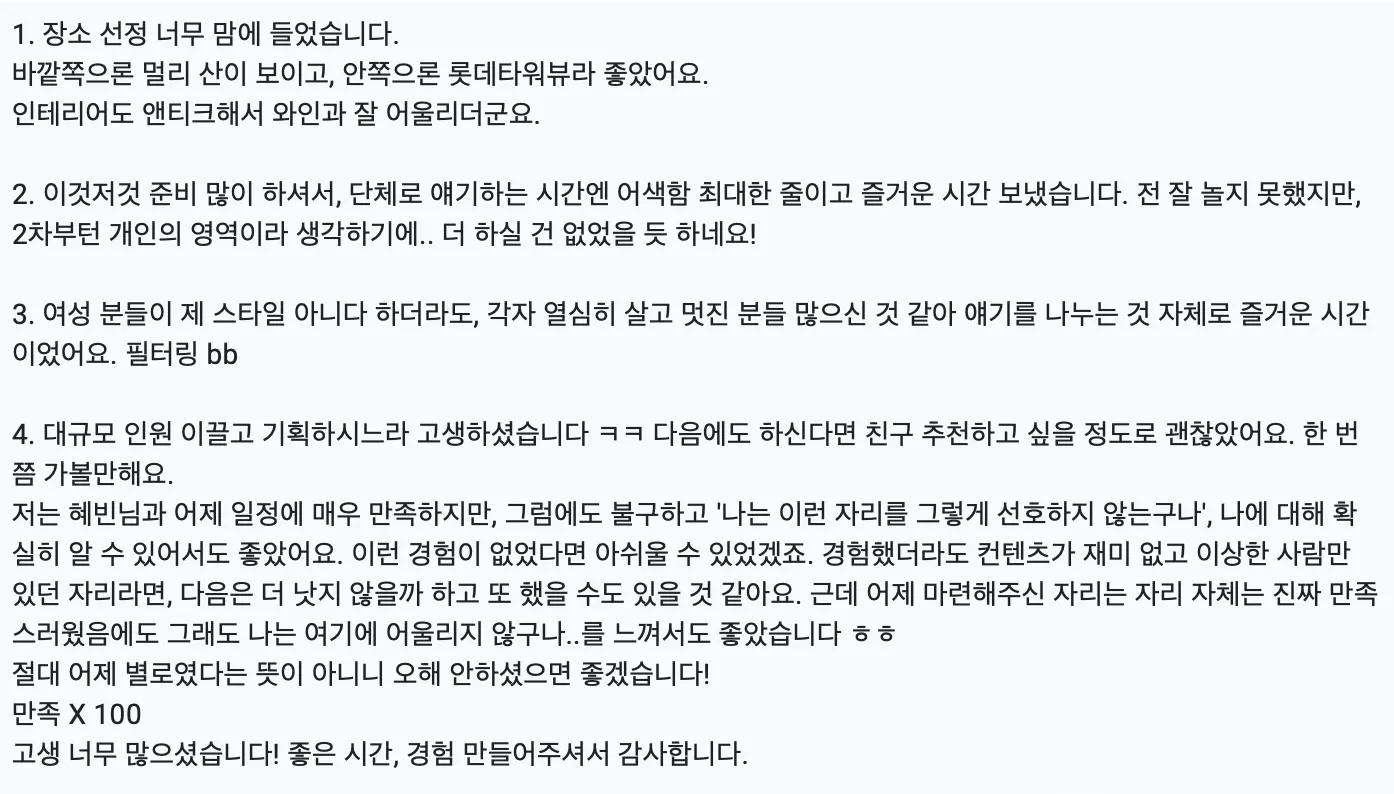그냥 남자들 여자들 이쁘다 신났다 도파민 터진다 이런 후기도 뿌듯하고 재밌긴 하지만 와서 생각 정리 되었다는게 나의 중추쾌감 찌르는 후기 ㄷㄷㄷㄷ저 이거 받자마자 너무 감동받아서 캡쳐하고 자랑 엄청했어여 그나저나 이거 이등 줄 후기는 아닌데 더 긴거 그냥 1등 줌 .. 미안 ..