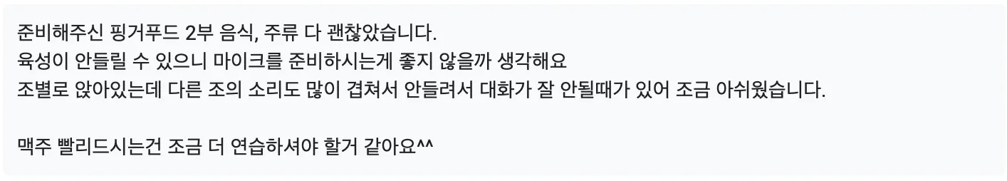 맥주 빨리기 마시기 같은 게임 같은게 한두개 정도 더 있었으면 좋았을거같아요!