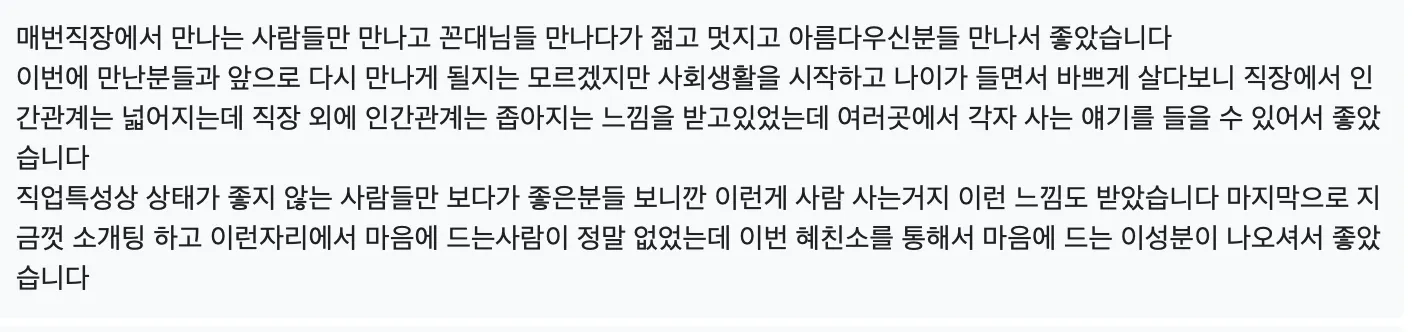 소개팅에서 만나기 힘든 사람들 제가 다 끌어모아용 호호. 세번 온 제친구가 했던 말: “혜친소 못끊는 이유는 엥간한 소개팅남들보다 괜찮은 사람들이 나와서야”