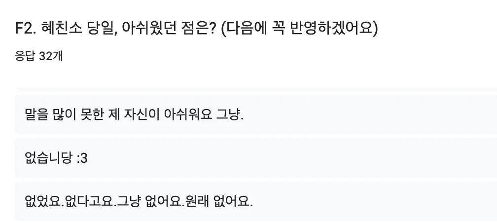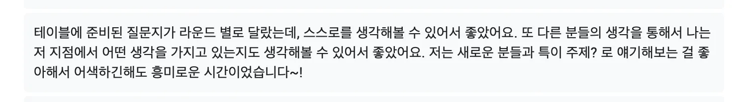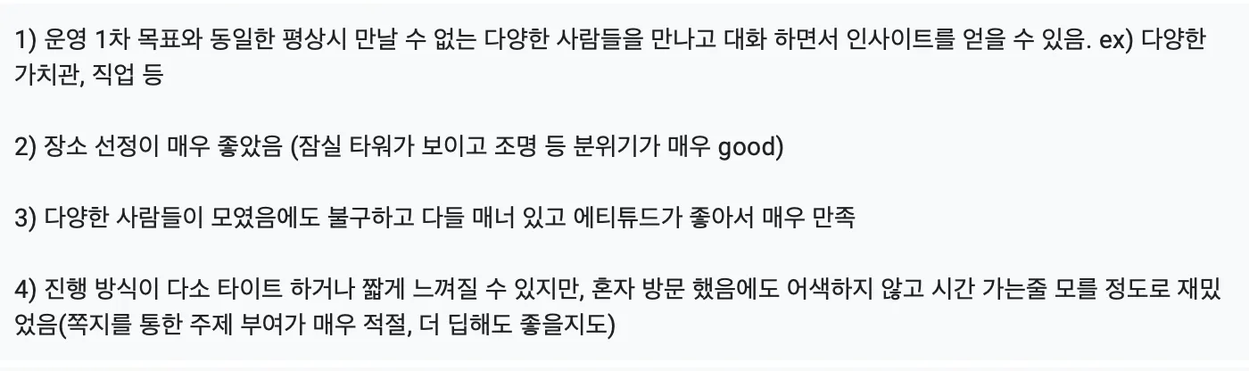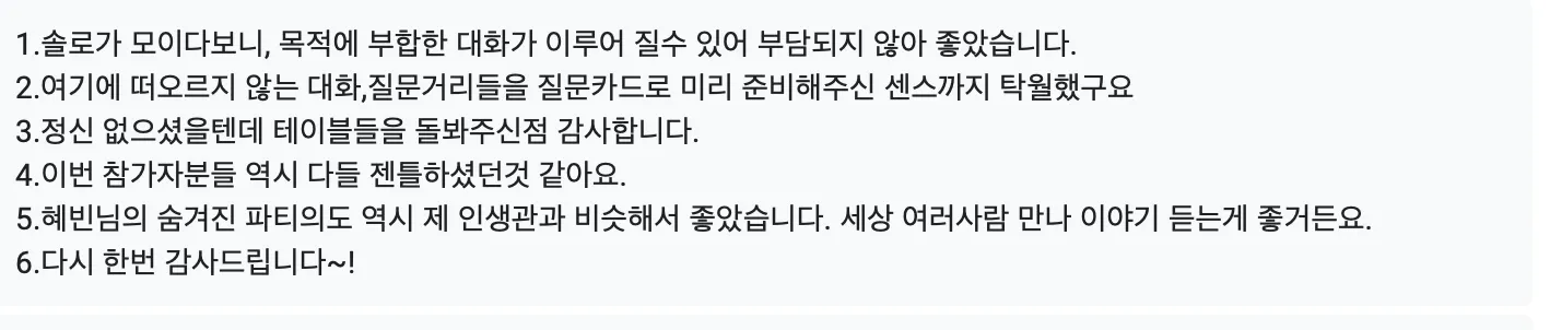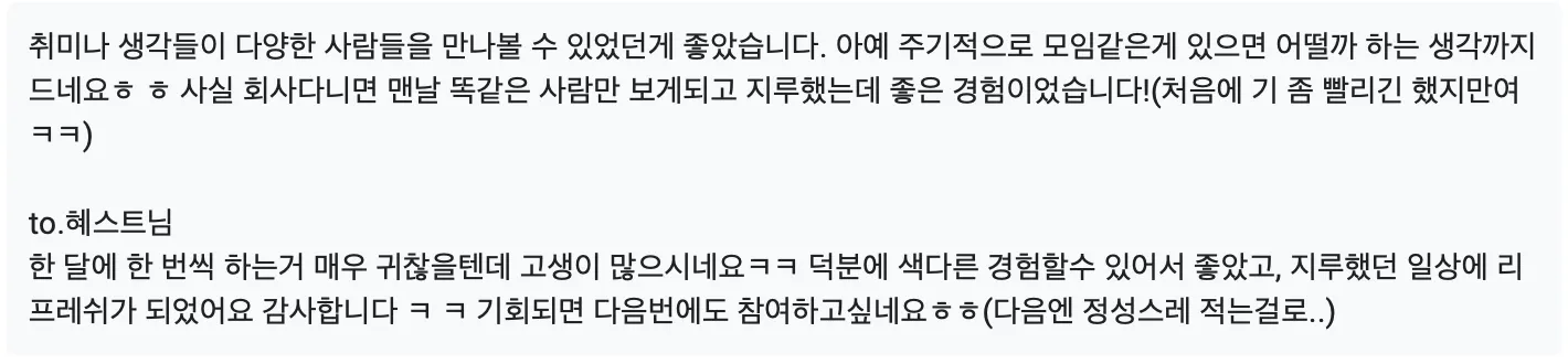 여튼 다들 먼 길 와주셔서 감사하구용 또 기회가 되면 한 번 다시 봤으면 좋겠숩니다!! 진짜 이번 기수 너무너무 다들 젠틀하시고 Literally 빌런0에 수렴해서 너무 뿌듯하고 좋았어요. 다들 매너 지키시고 왔다가주셔서 너무 감사해요.