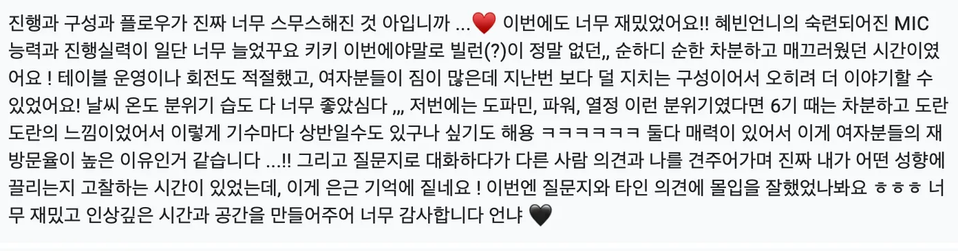 마자 빌런 하나두 없고 너무 차분해서 나 사실 당황했숩니다. 왜케 조용한지,,, 근데 이렇게 조용할 때 커플이 많이 탄생하더라구? ㅋㅋㅋㅋㅋ 맨날 길게 길게 후기 남겨주는 그대 너무 고마버요 진짜 너무 힘이 나 🩷
