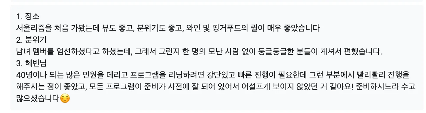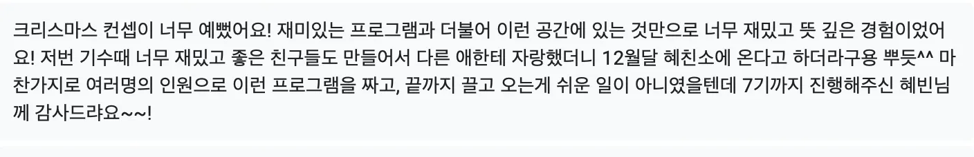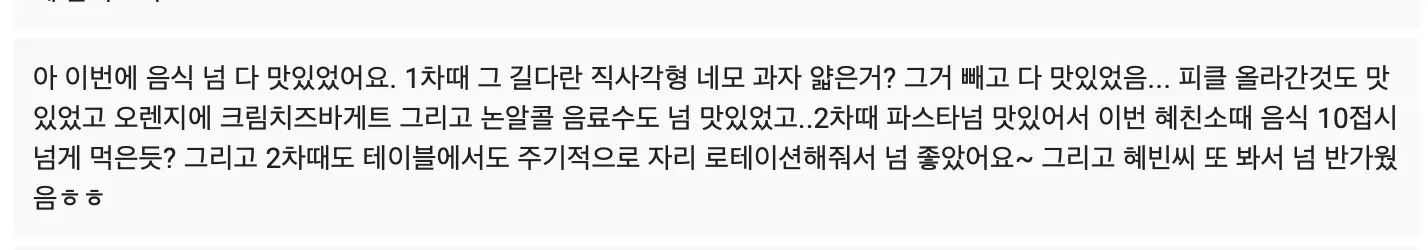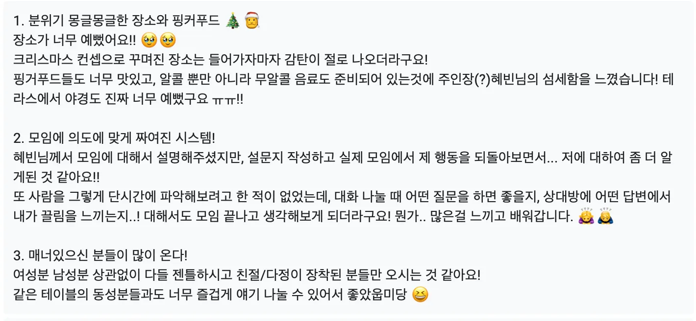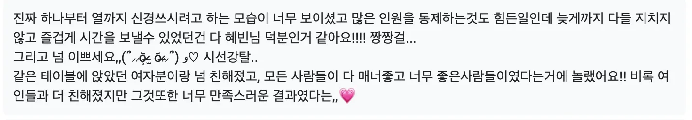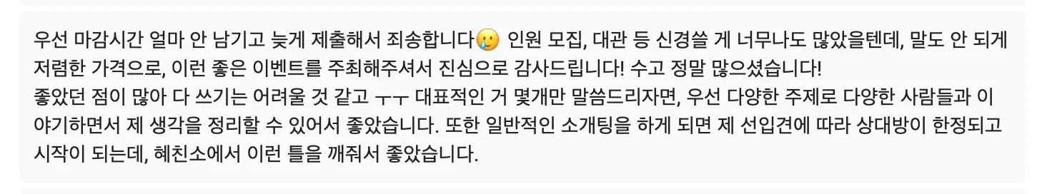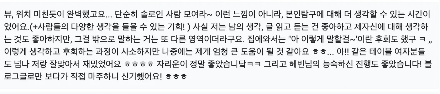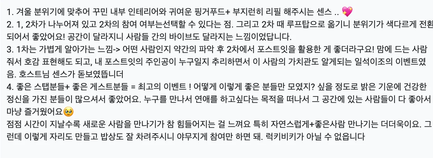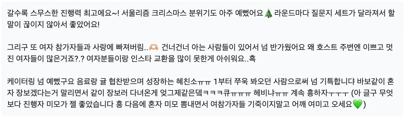 이게 단체소개팅이다 보니 어쩔 수 없이 기가 빨림 이슈가 생길 수 있고 고질적으로 나오는 아쉬운 점 피드백이었는데 이번에는 단 한건도 없었습니다!!! 특히나 이전에 오셨던 분들의 더욱 높아진 만족도에 … 혜친소도 그만큼 성장한 것 같아서 너무 뿌듯함 !!