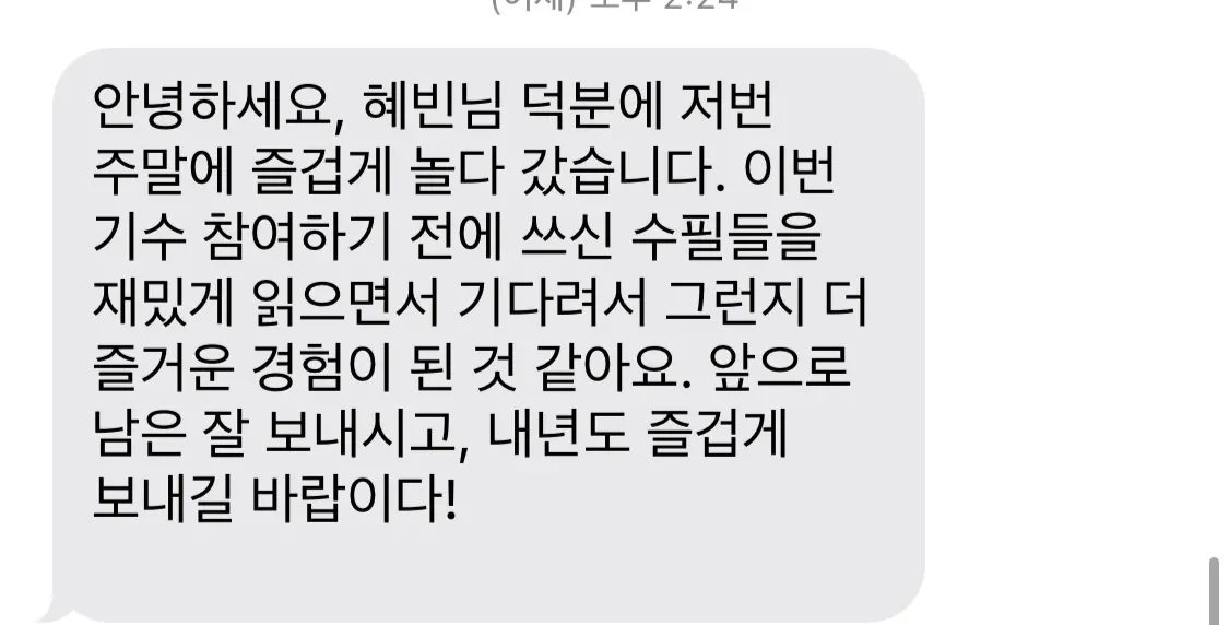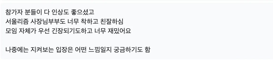 여튼 다들 먼 길 와주셔서 감사하구용. 또 기회가 되면 한 번 다시 봤으면 좋겠숩니다!! 진짜 이번 기수 너무너무 다들 젠틀하시고 Literally 빌런0에 수렴해서 너무 뿌듯하고 좋았어요. 다들 매너 지키시고 왔다가주셔서 너무 감사해요.