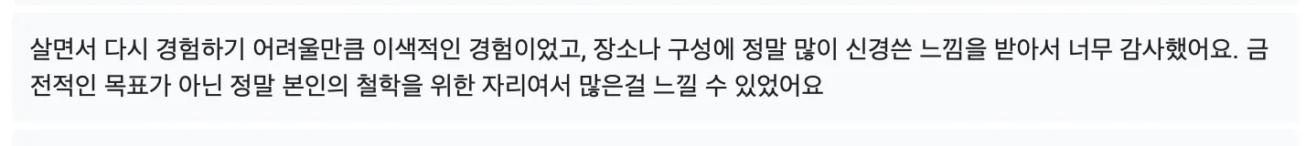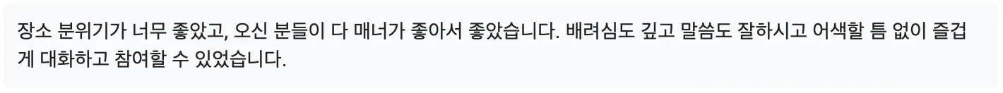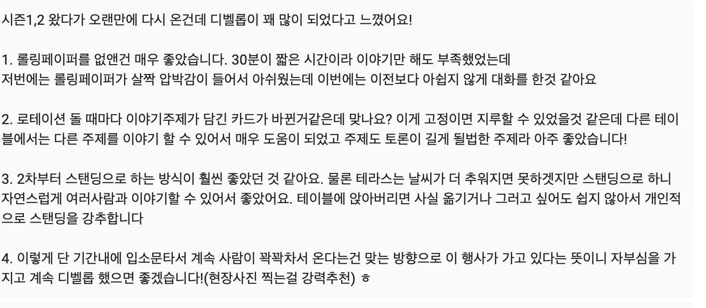 이렇게 사람들이 로테이션 안넘어 가려고 하고 화장실 타임 줘도 대화하느라 안간적 처음입니다. 초반을 제외하고 한 3라운드쯤부터 깔깔 거리는 소리 너무 들려서 내가 굳이 개입안해도 된 적 진짜 처음인 것 가튬 .. ? 다들 진짜 매너 뿐만 아니라 대화에 적극적으로 참여하려는 + 분위기 다운 시키지 않으려는 에티튜드 갖추고 임해주셔서 넘 감사합니다!! 진짜 역대급 현장 반응이었어요!