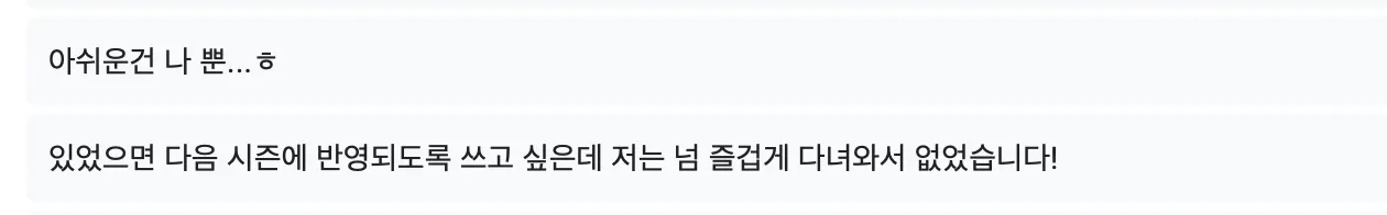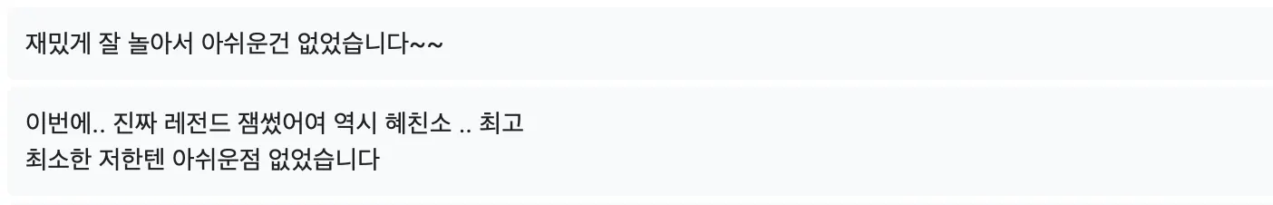 이건 진짜 매우 긍정적인 피드백으로 보입니다. 재밌으니까 시간이 짧게 가는거겠죠? 좀 루즈할 때는 사람들 시간길다. 기가 쫌 빨렸다. 이런 소리밖에 안했는데 아쉬운점 피드백이 ㄹㅇ 다 아쉽다는 소리 뿐입니다.