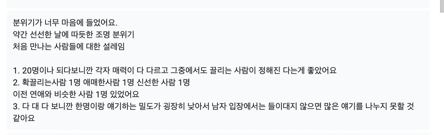그건 리얼 1:1 소개팅을 가야합니다…!! 그니까 소개팅과 이런 단체 만남의 장단점을 명확히 구분하면 좋을 것 같아요