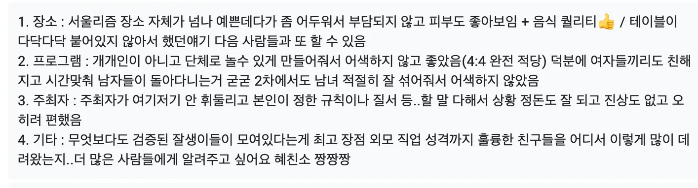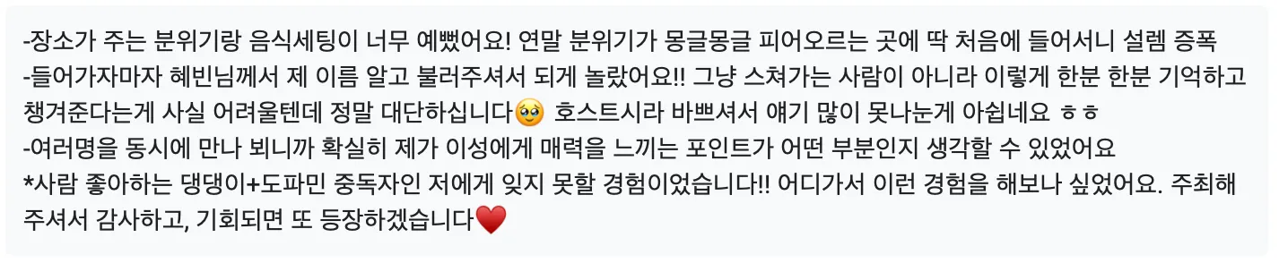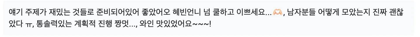 딱 6층에 도착하자마자, 뭔가 다른 공간에 온 느낌이 들어서 너무 좋았습니다~ 진짜 다 좋았는데, 처음에 직업 나이 비공개인점이 제일 좋았던것같아요! 혜빈님의 마인드인 정량적으로 사람 평가하지말고 대화로 알아가자~ 이런 부분이 정확히 녹아있는것같아서 일단 대화를하고나서 2차때 나이나 직업 물어보면서 보니까 또 다르게 느껴지더라구요! 처음에 딱 시작했을때, 어떻게 대화가 진행되려나 싶어서 막막했는데 질문지 바뀌는거, 혜빈님이 중간중간 대화걸어주는거, 맥주빨리마시기대회 등 너무 부담스럽지않은 긴장감이 이어지는게 너무 멋있었어요 ㅎㅎ 아무리 기획을 잘한다고 해도 참가자가 당황하지않게 진행하는건 다른이야기 인데, 정말 길다면 길고 짦다면 짦은 시간이었지만 이걸 한사람이 기획했다고??? 하면서 매순간 놀랐던것같아요. 어제는 긴장해서 우와우와 거리기만 했는데,,