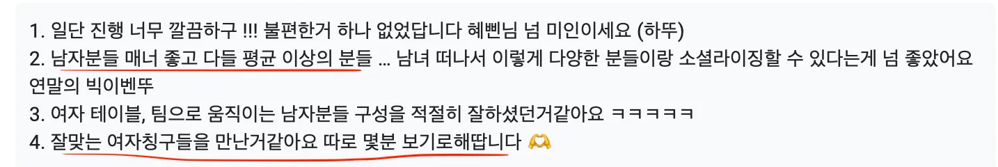 누군가와 깊게 대화하는건 혜친소 그 이후 단계에서 둘이 알아서 하는게 맞다고 봅니다. 뭐 깊게 대화하기 전에 만나고 싶은 생각이 안든다? 라고 말한다면 할말이 없지만요,,, (근데 그것은 외적 끌림부족 이슈 아닐까..? ) 혜친소에서는 그냥 가볍게 이런 사람들이 있구나 파악하는 자리!!! 이기 때문에 그 이상은 기회는 사후의 여러분들에게 넘깁니다. 모든걸 다 맞춰줄 순 없숴!!!!