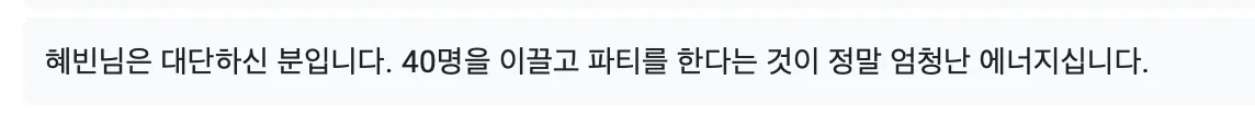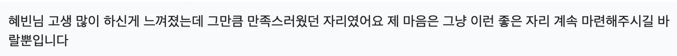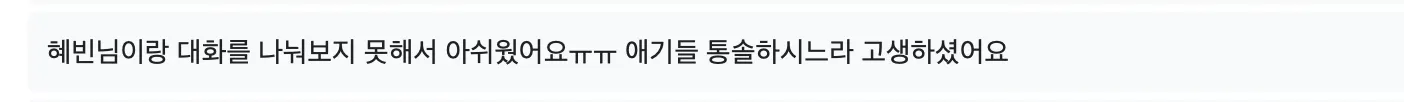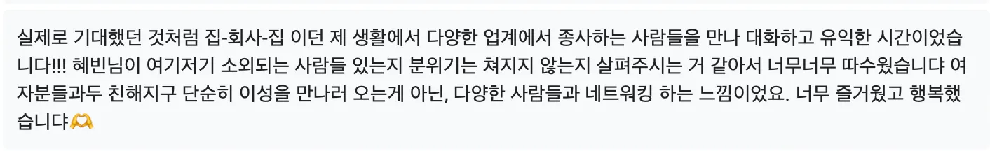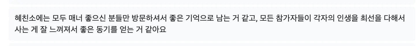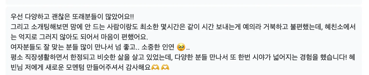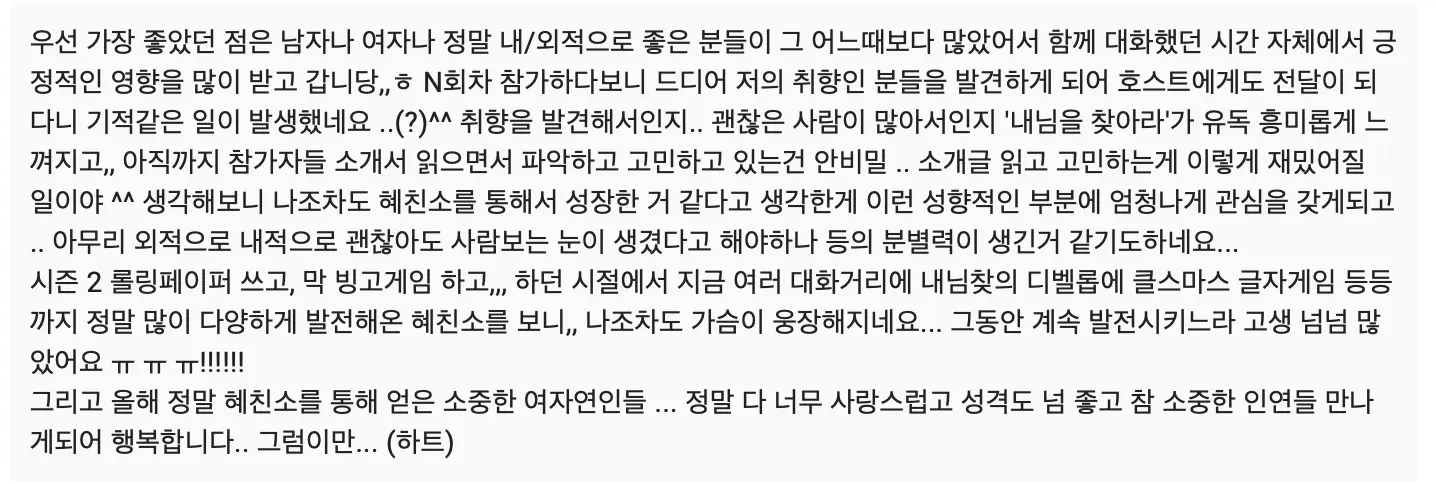 오늘 이 설문지 작성하면서 다시 놀라고있습니다 솔직히말하면 2차때 오히려 혜빈님이랑 대화를 해보고싶었답니다 8ㅅ8… 나중에 혜친소 스핀오프로,, 혜빈님과 친해지는 자리도 만들어주세요! 잠깐 스쳐가는 자리에서 기획자 직무로 다시 준비하고 계신다고 들었는데, 어떤 운좋은 회사가 혜빈님 알아보고 데려갈지 ~~~~~ 긴장해서 어버버버 거렸던 자리였지만, 혜친소 시즌 10 진짜 정말 재미있고, 멋있었어요! 아 그리고 하나더,, 이번에 혜친소하면서 제가 어떤 사람을 편해하는지 정확히 알았던것같아요! 정말 다양한 성향의 사람들과 대화하면서 같이있으면 대화가 재미있는 사람과, 그래도 함께 있을때 편안하게 즐거울것같은 사람 성향을 구분하게 되었습니다! 진짜 이걸 깨닫게 될줄이야.. 혜빈님 진짜 쵝오에요 ㅠ 다음에 또 참가하고싶어요! 다다음에 한번더 신청서 낼래요..거부하지 말아주세용 8ㅅ8