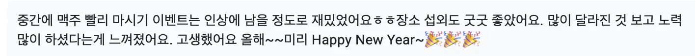전에 갔을 땐 2차에서 빙고게임을 해서 많은 사람들과 스몰톡하며 얘기할 수 있었는데, 이번엔 그런 진행 없이 2차를 진행하다보니 초반에 살짝 머쓱하고 어색하고 그랬던 것 같아요!