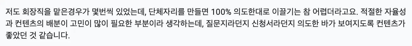 인원이 20명은 조금 많다고 느꼈어요! 너무 많다보니 모든 인원을 알기 조금 짧았던 것 같습니다:)
