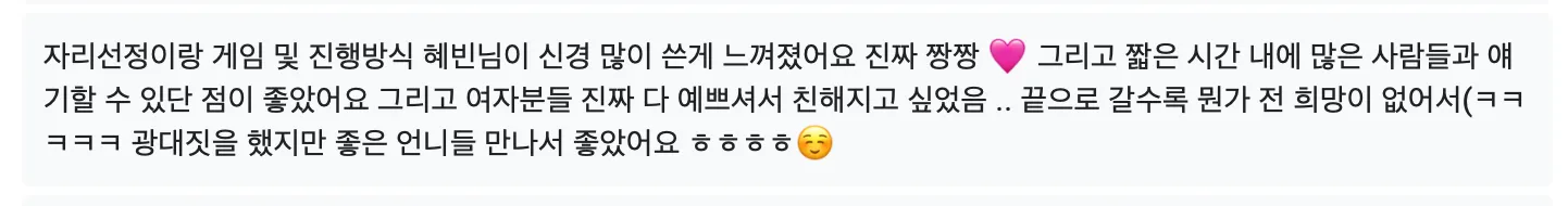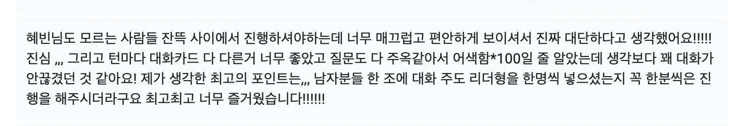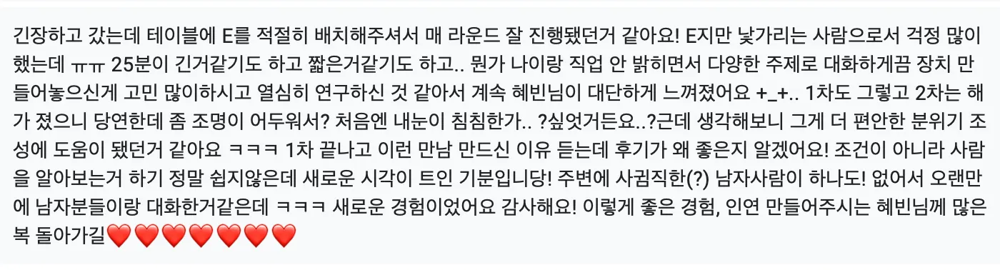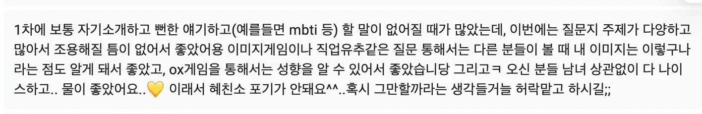 너무 욕심이지만 돌아가며 얘기를 나눌 수 있는게 좀 길었으면 좋겠습니다 / 1차에서 이성에 대해 더 알아볼 시간이 주어지면 좋을꺼같아요.