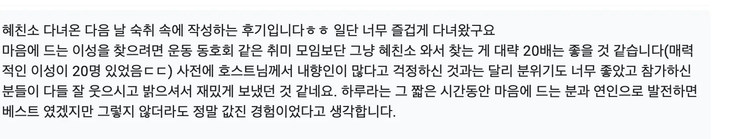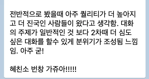 자 그래서 혜친소를 조금 더 해보자 라는 의지 + 기적적으로 1년을 끌고온 것을 기념하기 위해 혜친소 1주년을 조금 더 특별하게 하고 싶어졌어요!! 그동안 혜친소를 하며 느껴온 바 + 인사이트를 농축해서 담고 싶었슈. 사실 여러분들의 대화가 그냥 재미있었던게 아니라 다 그간의 경험과 인사이트를 바탕에서 나온 나의 의도적 설계에 의한거거등요?ㅋ 예를 들면