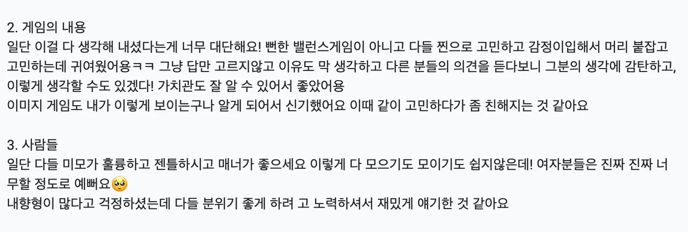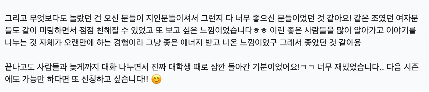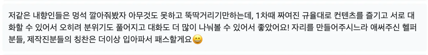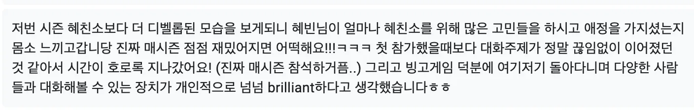 제가 여러 시즌 해봤지만 이번 시즌마냥 저도 재미나고 뿌듯? 해진 기수는 없었습니다. 칭찬이든 감사의 인사든 이렇게 오래 받는 시즌이 없었고, 참가자들의 만족도가 이렇게까지 생생하게? 전해진거는 시즌4?이후로 처음이에여!! 사실 그때는 비주얼 파티로 인해 1차원적인 도파민만 터진? 느낌으로 분위기가 좋았던건데 이번엔 은은하고 잔잔하게? 오래오래? 만족하는 것 같아서 다른 결로 기분이 너무 쪼아용.. 진짜 너무너무 쪼아… 뿌듯터져부려 ㅠㅠ
