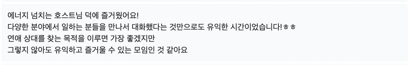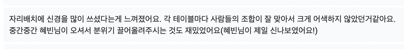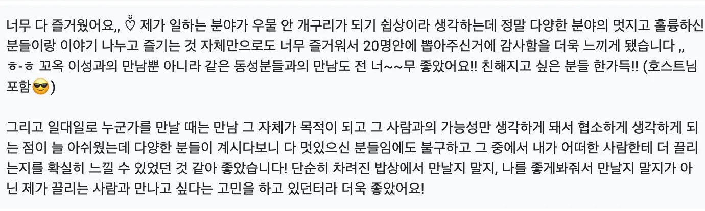 2차에 저처럼 낯가리는 사람은..ㅎ 테이블을 돌아다니기가 어려웠어요! 뭔가 자연스럽게 돌아갈 수 있는 장치가 있다면 좋을거같아요..ㅎㅎ