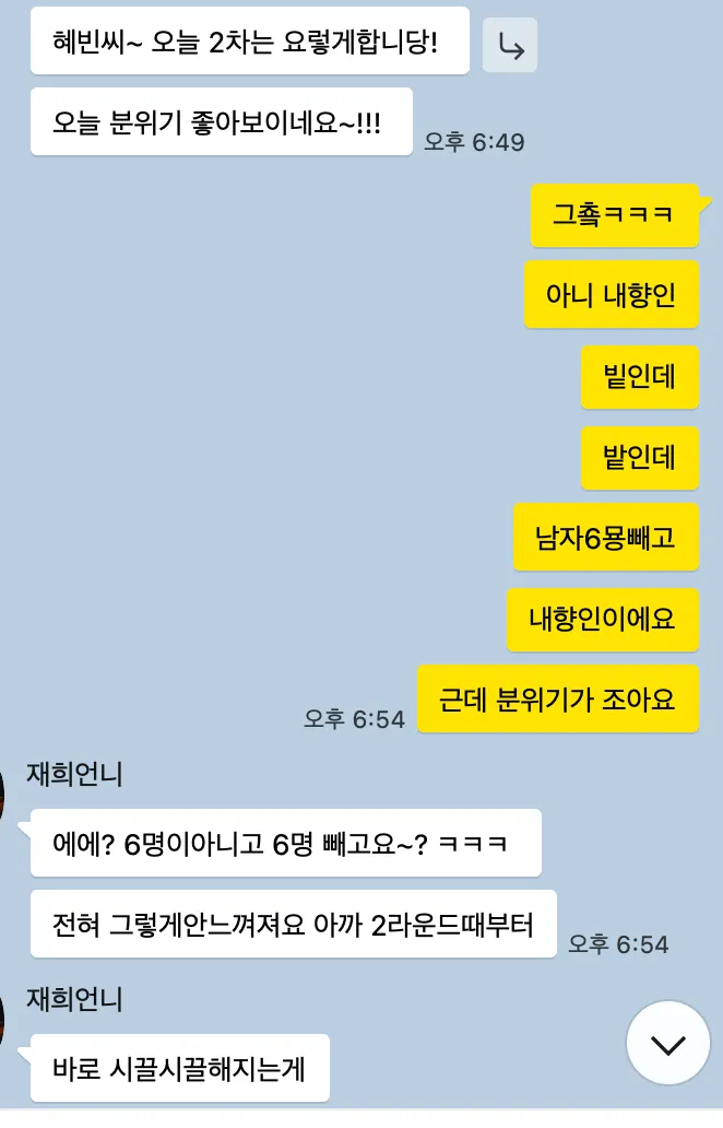 원래 한 많으면 3명? 정도 최소 1명 정도는 안넘어오거든요? 나름 높은 참여율이긴한데 그럼에도 불구하고 한명도 빠짐없이 2차 다 온적은 처음이에요!! 다들 내향인이라고 한거 아니였냐고!!