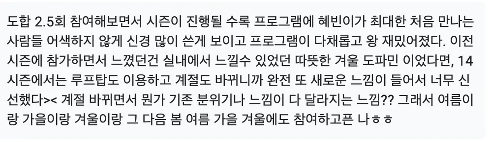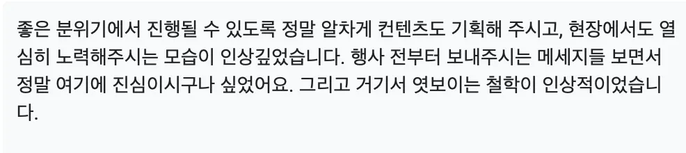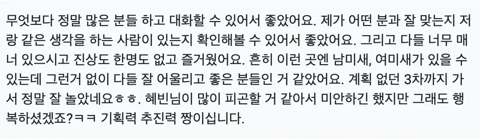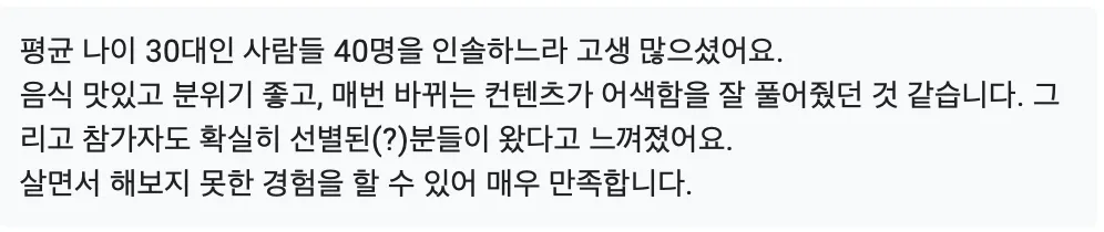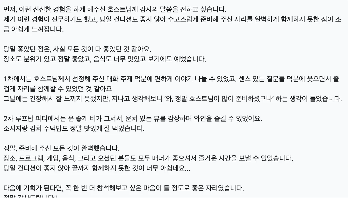 이번에 좀 사람들이랑 대화를 많이 안해봐서 .. 저도 아쉬움이 많이 남네용 흐규규~~!! 보는 사람마다 실시간으로 늙는 것 같다곸ㅋㅋㅋㅋㅋ걱정 한마디씩 해주는거 보고 넘 체력관리 안한 것 같아 민망;;🥹 (는 그날 하루종일 요가하고 관리했는데 왜 구랫지 비와서 그런가 ^^) 여튼 다음에 오면 쩌렁쩌렁 호스트의 호랑이 기운을 보여주꼐 너무 억울하다! 다시와!!