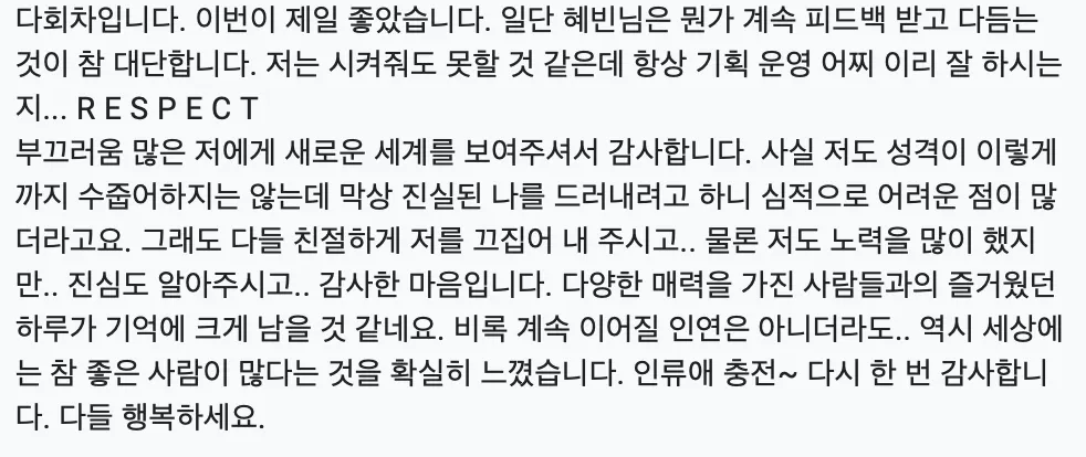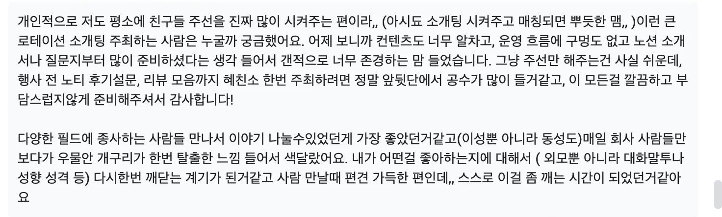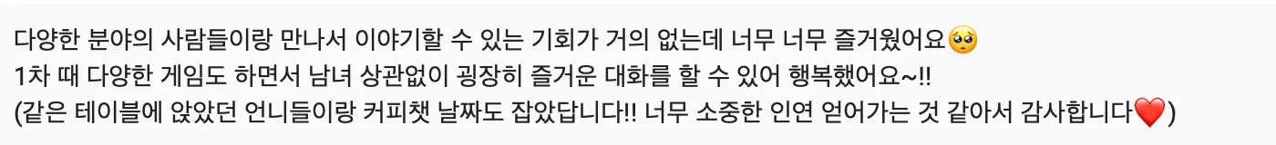 사전 미션에서 골랐던 사람을 찾는 부분이 혼잡했던 것 같아요 전에 골랐던 사람이 어떻게 대답했는지 자리에서 다시 읽어보기 + 그 전 1차에서 나눴던 이미지가 무엇인지 다시 생각 + 사람이 많음 등등의 이유로 기가 빨리는 기분..! 이 잠깐 들었어요!