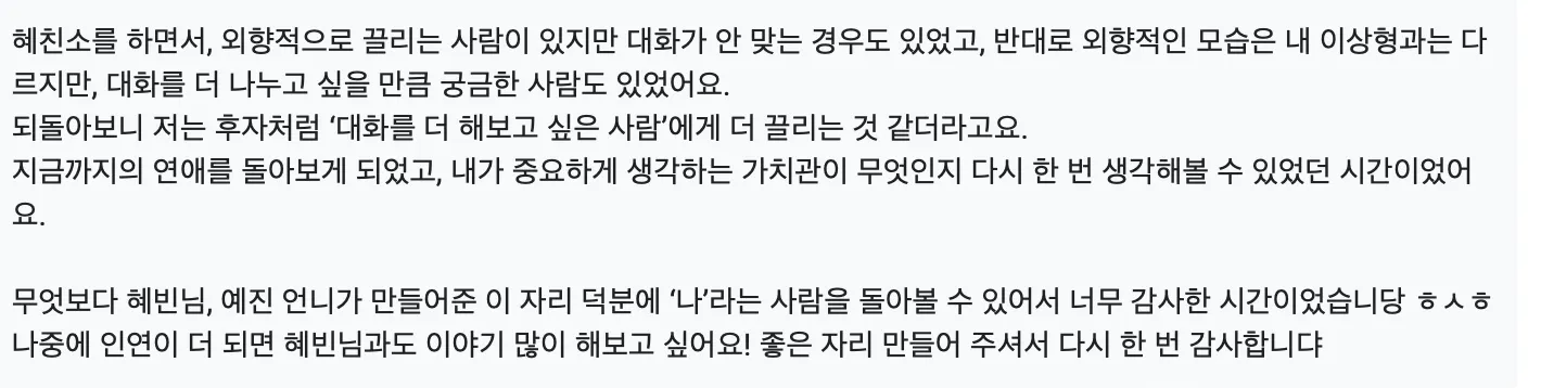 특히나 2번. 아무리 본인 이해도와 원하는 이성상이 뚜렷해도 그 사람을 알아보는 눈이 없으면 말짱 도루묵이라는걸을 시즌1에서 보고 깨달았습니다. (일단 남자들은 그냥 다 필요없고 예쁘면 고르는 경향이 있었음) 그래서 그 다음 시즌인 혜친소 2에서 시작한게 바로 ‘내 님을 찾아라’ 미션입니다. 이 미션을 통해서 사람을 파악할 수 있는 활동을 해볼 수 있게 하고 싶었거든요.