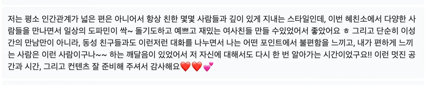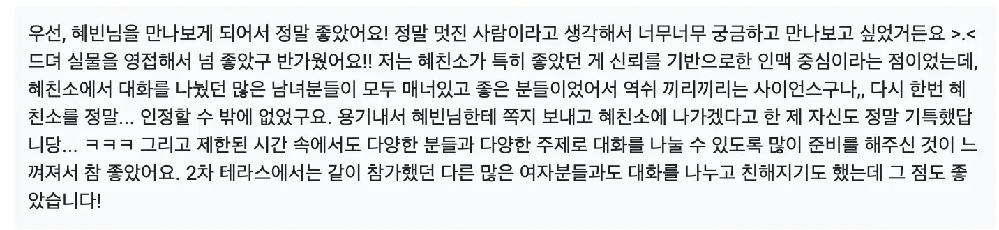 여튼 .. 저런 방식보다 보다 나은 방법이 있다는 것을 몸소 체감한 자로써,,, 더 많은 사람들을 더 나은 방식으로 만나게 해줘야겠다는 나름의 인생목표?가 생겼기에,,,, 에리히프롬좌의 철학을 바탕으로 혜친소를 이런저런 방법으로 설계해보게 되었습니다. (나름 나만의 사회 운동..)