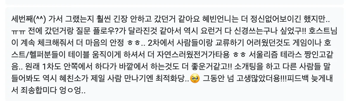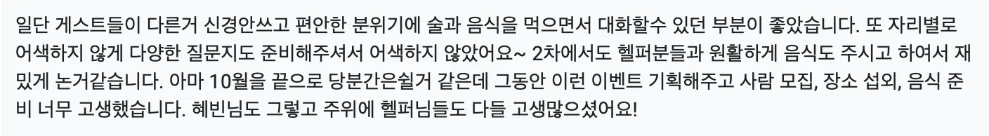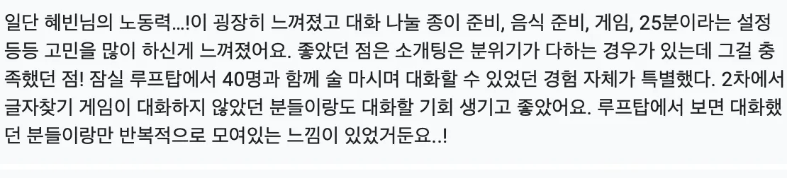 아는분들끼리 뭉쳐있는거 같아서 끼어들기 약간 어려운 느낌, 남자들끼리 오히려 전우애 생기는 느낌?ㅎㅎ 2차도 로테이션 형식으로 진행돼도 좋을 듯 합니다.