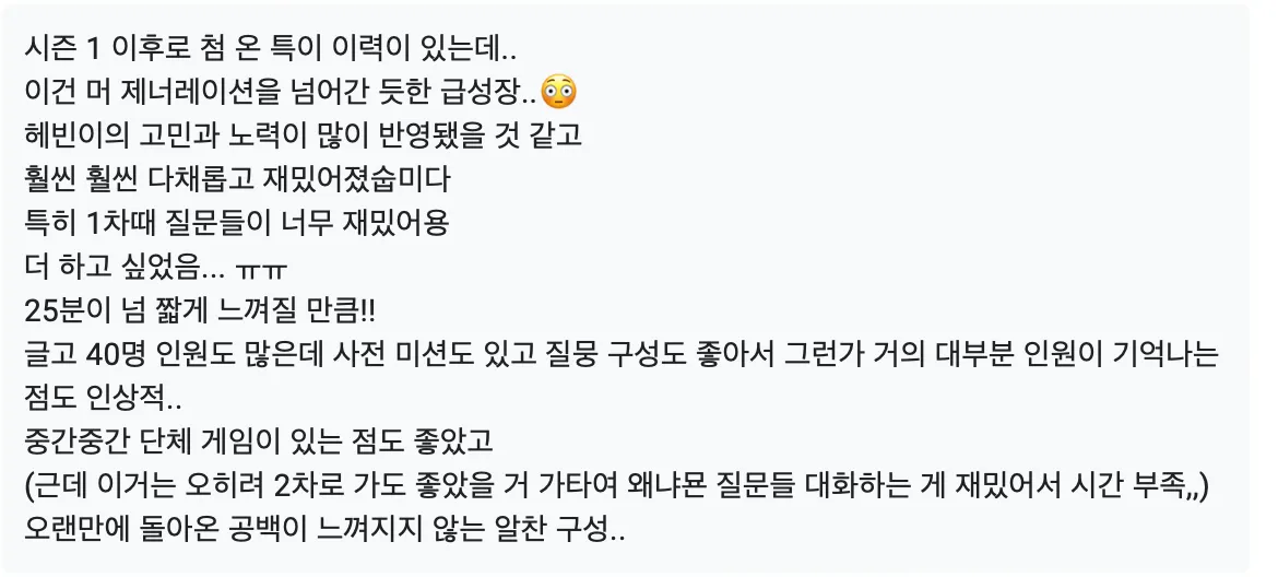 이거 욕인지 칭찬인지 모르곘지만, 제가 한번 쓱 둘러보니까 이번 시즌 남성분들 진국 많은거 같았어용 ^^,,, 좀 잘 노는 (소위 말해 양끼 낭낭한) 사람들 많으면 재미는 있거든요? 분위기 어떻게 띄울줄 아니까?
