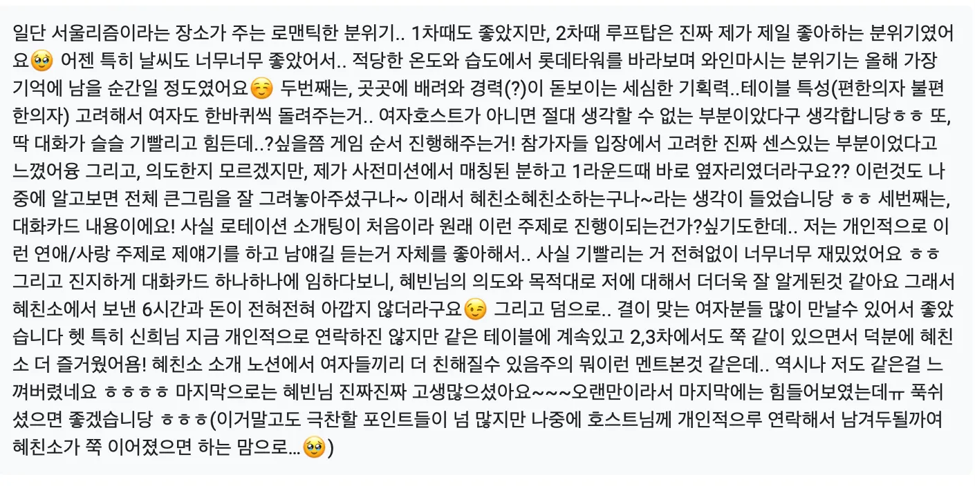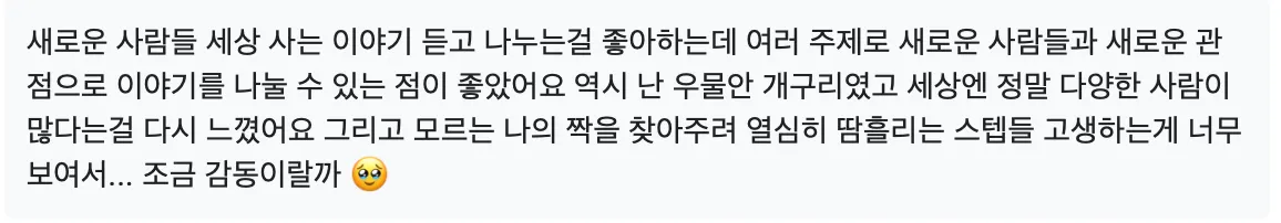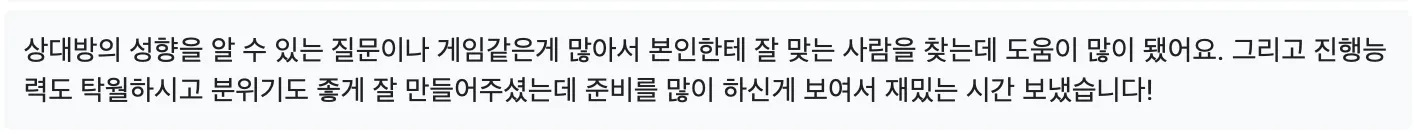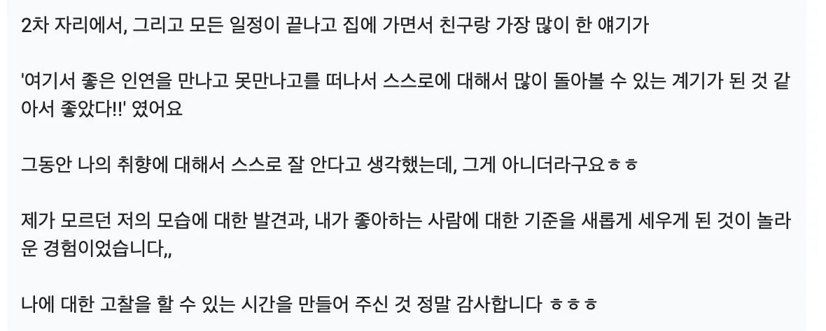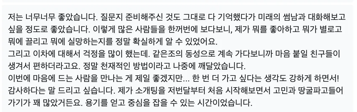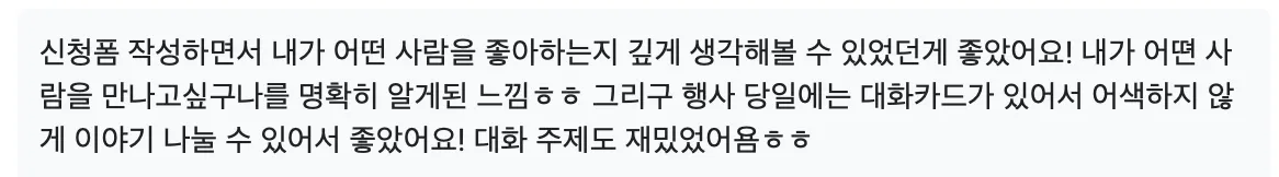인스타 교환이 안되는게 좀 아쉬웟어요! 사람이 많고 괜찮은 사람이 많다보니 친구로 지내거나 둘이 만나서 이야기를 나눠보고 싶엇는