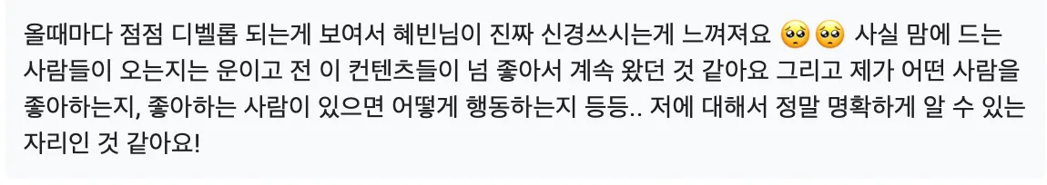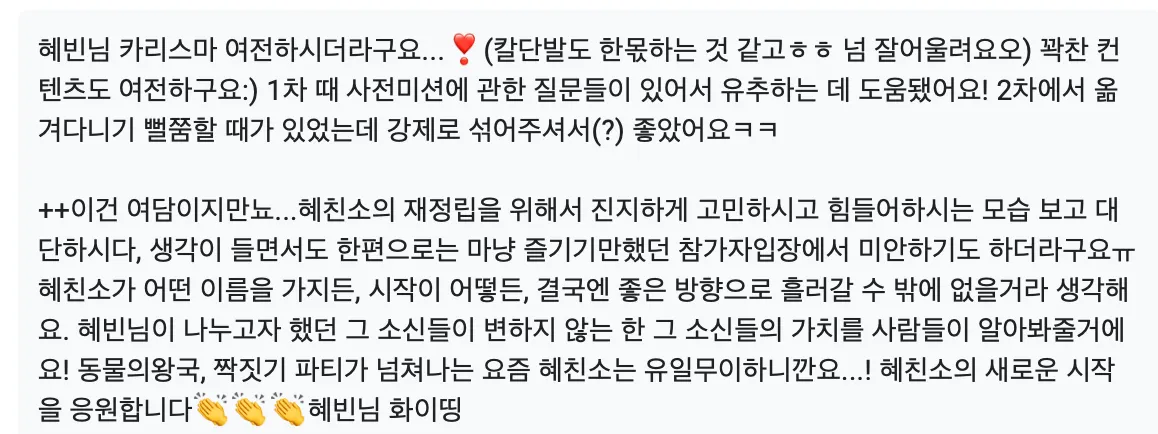 ✚아 그리고 지난 1년 반 동안 혜친소를 하면서 느껴온 인간 관계/ 남녀 관계 인사이트를 혜친소 마무리 감사 편지에 담아 작성하고 있습니다. 지금까지 왔던 모든 참가자들에게 주려고 준비하고 있으니 궁금한 사람은 단톡방 남아있기 ㅋ 아마 12월 전에 전달하지 않을까여? 여튼 그럼 찐으로 안뇽