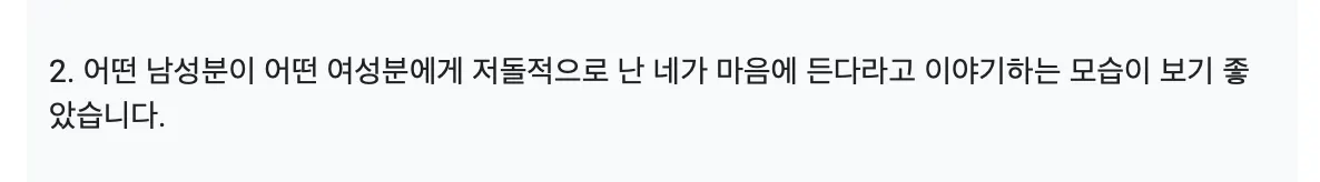 ⇒ 저도 느낌 이번 시즌 유독 그런 것 같기도? 근데 맘에 드는 사람이 없어서 그런게 아니라 그냥 수동적인 분들이 많은 느낌 + 위에 비하인드에서 푼 이유랄까?