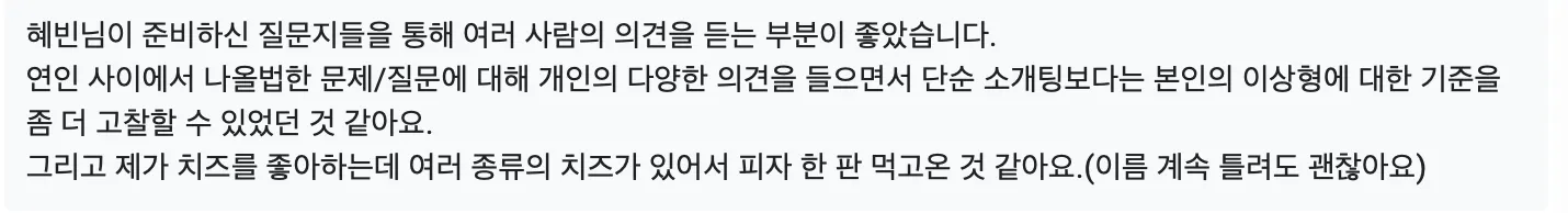 이번에 좀 조용하고 ,, 시끌벅쩍하지 않았던 이유가 여기에도 있지 않나 싶습니다? 나쁜 의미가 아냐!! 소개팅시켜주기 참 좋아보였달까 ..? 여자분들 필독해! 매칭 된 사람들이랑 진짜 잘해보시고 아쉬운 사람있으면 놓치지말기~~?